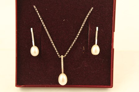 A SUITE OF RHODIUM FINISHED WHITE GOLD COLOURED METAL JEWELLERY, comprising a pendant, a pair of earrings, each set with diamonds and a single pendant pearl