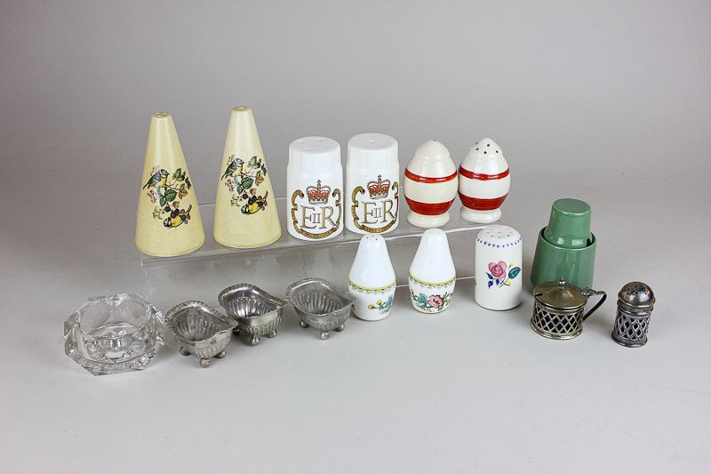 together with a collection of salt and peppers and a Poole Pottery mustard