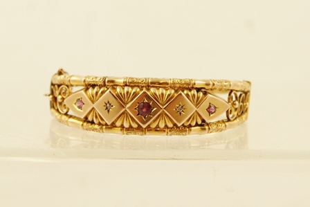 A VICTORIAN 9CT GOLD BANGLE, tooled with stylised bamboo and set with three rubies and two diamonds, marks rubbed, 14g. gross