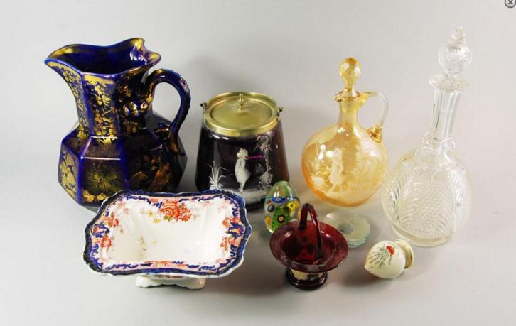 decorated with two children in the style of Mary Gregory, together with a peach globular glass decanter, an oval paperweight inset with flowers, a clear glass decanter, a cranberry glass basket, an Arcadian China pepper pot, a Wedgwood tureen base an
