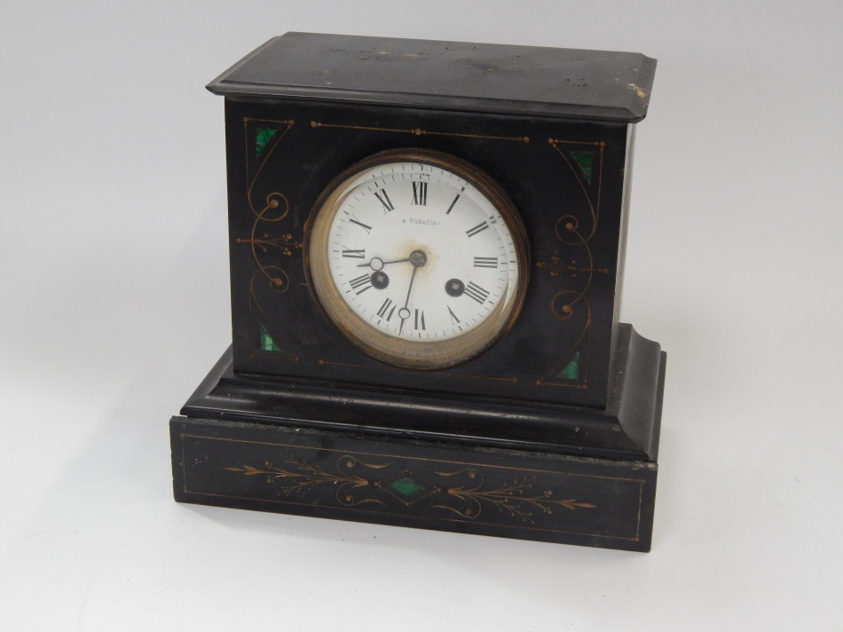 in grey slate case inset with malachite and gilt outlines, and with white enamel dial signed R Russell