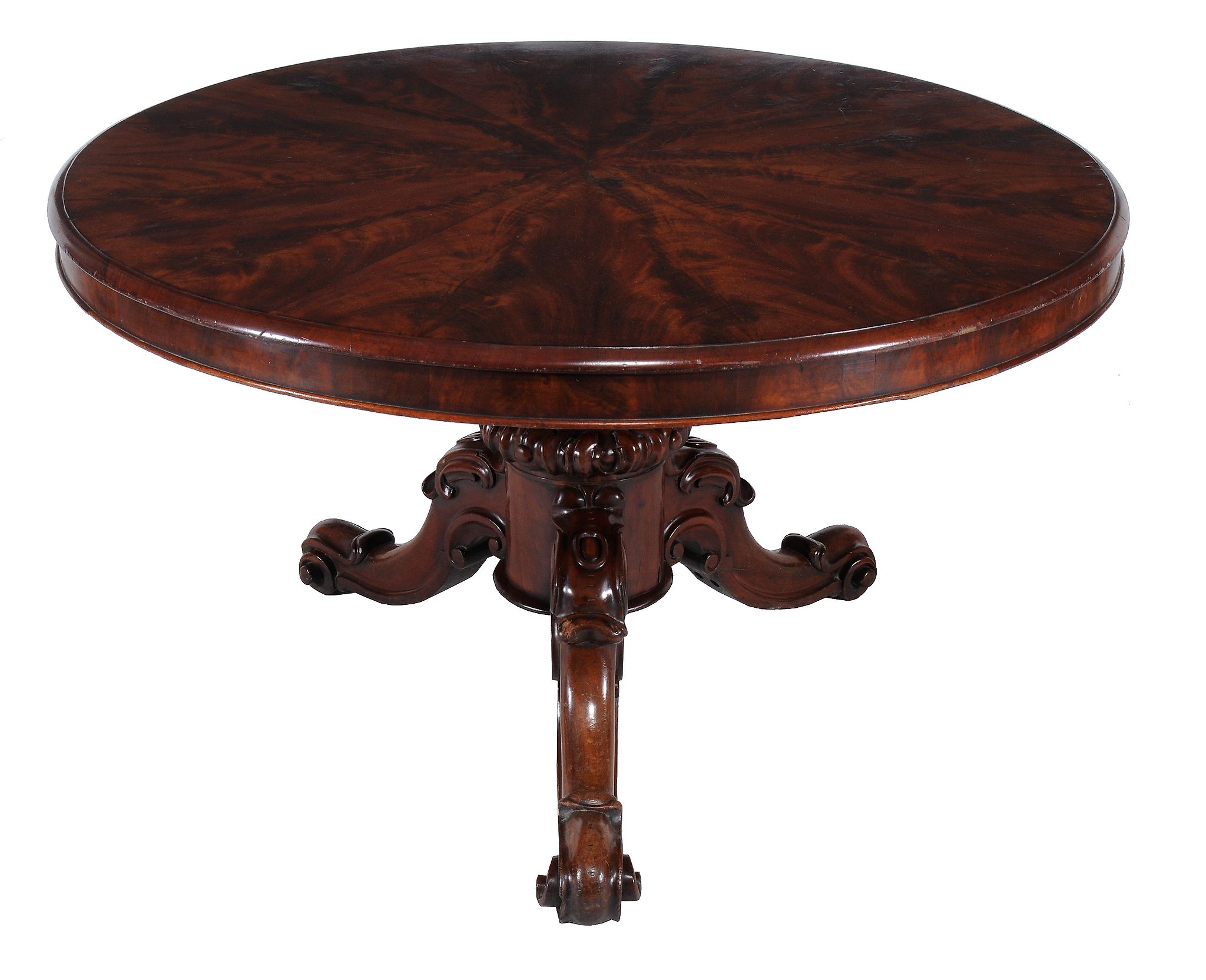the top with figured mahogany radiating veneer, the stem carved profusely with foliage, the scroll carved cabriole legs on scroll feet and casters, 71cm high, the top 129cm diameter