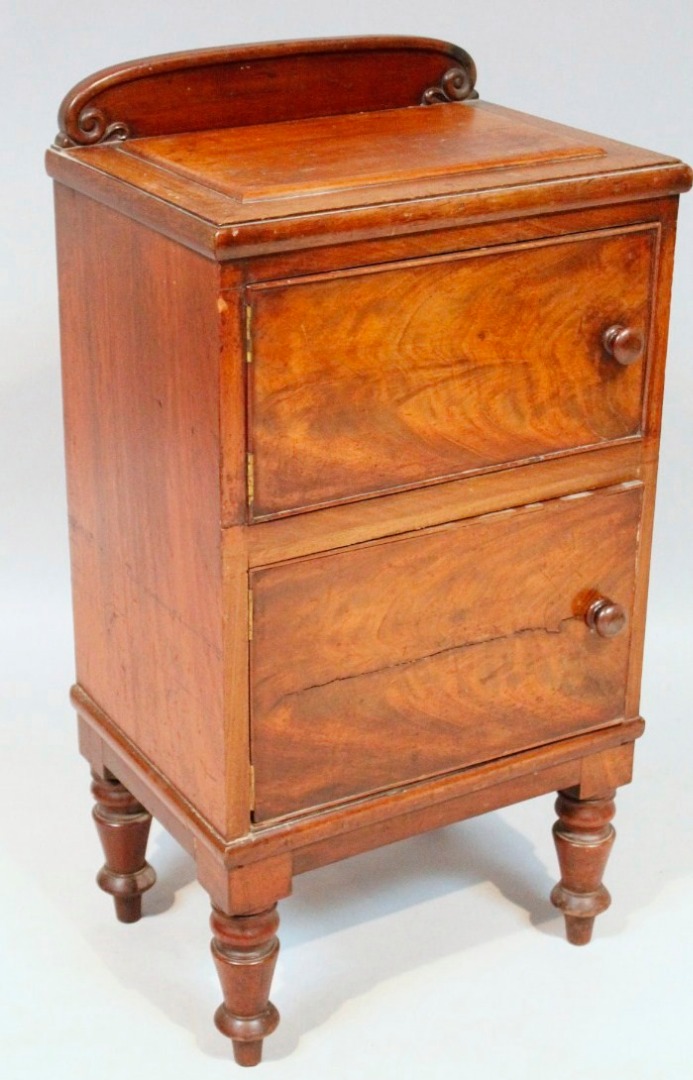 the scroll back cornice raised above a moulded section and fronted by two flame veneered cupboards each with a cock beaded outline revealing plain interiors on turned cylindrical feet