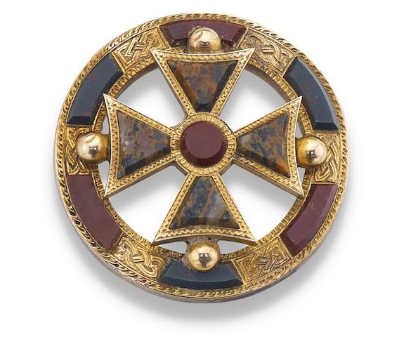Of circular form entering on a cross, with engraved Celtic motifs and bead detailing, set with vari-coloured agate plaques, mounted in gold, diameter 38mm