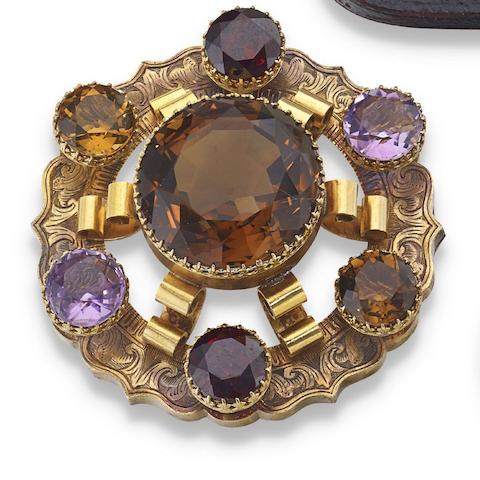 Set centrally with a circular-cut citrine, to a raised scroll setting, framed by an engraved surround further set with circular-cut citrines, amethysts and garnets, mounted in gold, diameter 45mm