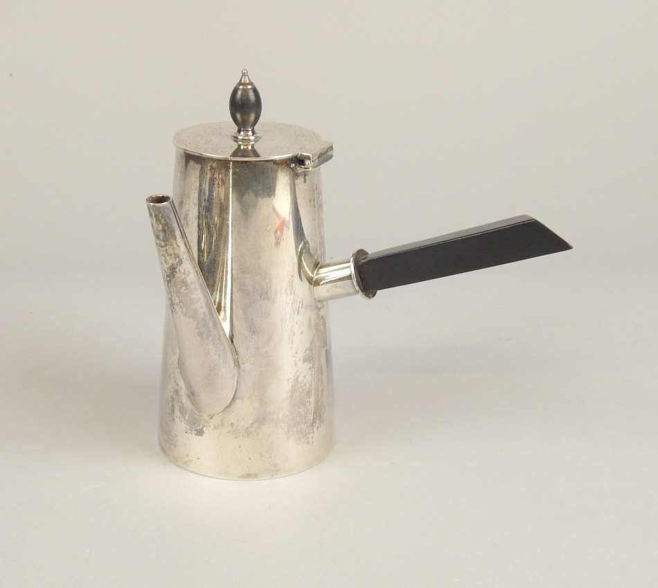 A Victorian silver chocolate pot in the manner of Dr Christopher Dresser