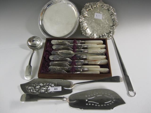 A Victorian silver Fish Slice with pierced blade, old english pattern, London 1840, two small plated Card Trays, one with gadroon edge on three scroll feet, other with engraved centre, shell scrolled edge, a plated Meat Skewer, a plated fish Slice, S