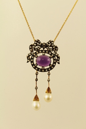 A VICTORIAN STYLE GOLD COLOURED METAL SET AMETHYST, PEARL AND DIAMOND PENDANT, having oval cabochon centre stone bordered by seven 8/8 cuts with bow top, set with seeds and two larger pendant pearls below, on chain