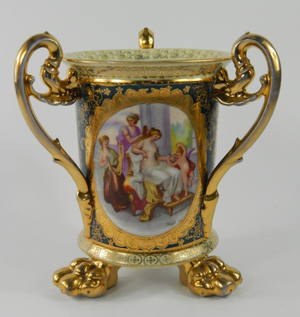 printed with a scene of Neo Classical maidens, in the manner of Angelica Kauffmann, within gilt borders, on three paw feet