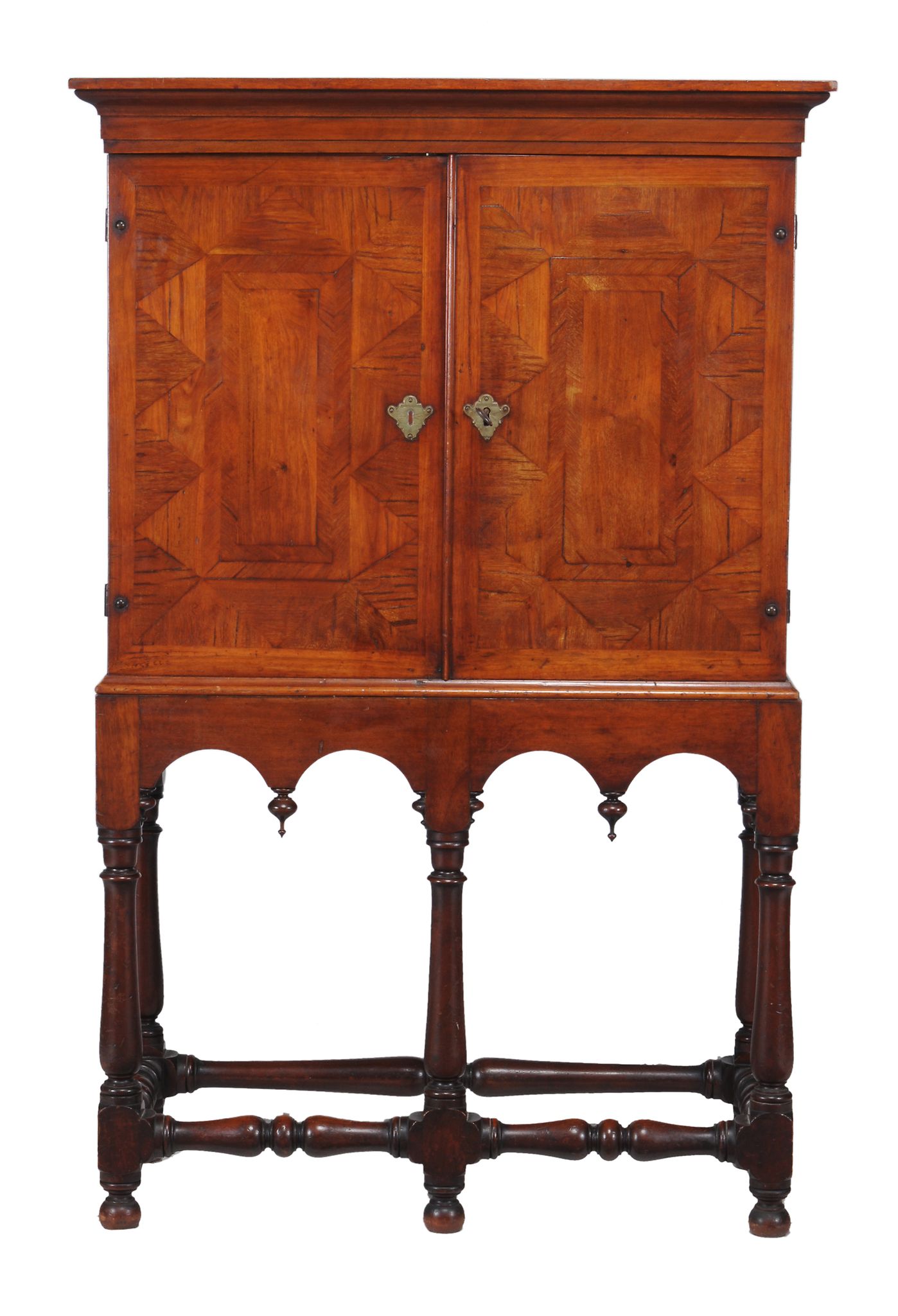 the moulded cornice above parquetry doors enclosing an arrangement of drawers and central cupboard door enclosing further drawers, the arcaded stand with drop finials and turned supports above conforming stretchers and feet