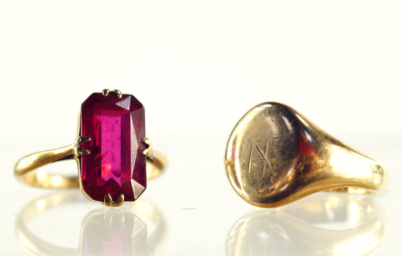 band stamped platinium, size K, 2.3g, and two further rings comprising a yellow metal signet ring, size H, 4.7g, and a dress ring, size H,