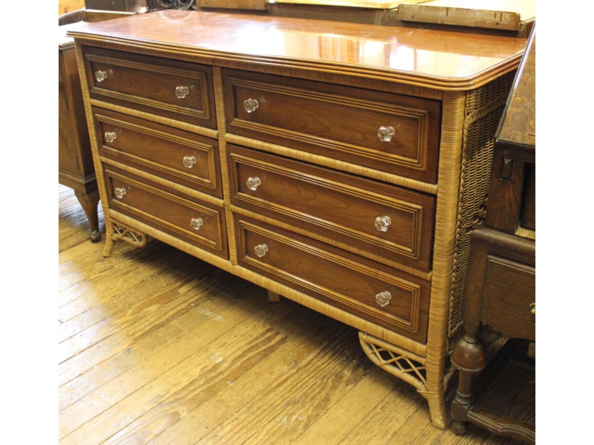 A wickerwork chest of drawers, the serpentine top over two banks of three drawers, on outsplayed legs