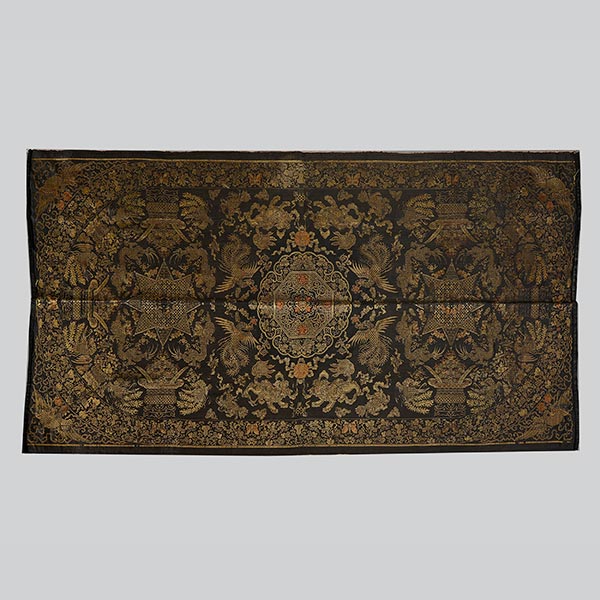 Woven in pale yellow and orange threads to a black ground, featuring floral and diaper pattern roundels to the center with dragons and phoenixes throughout, enclosed by a band of scrolling leafy double gourds and butterflies. {40 1/2 x 78 1/2 inches