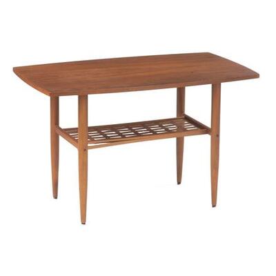 Alberts Tibro , table basse en teck avec tablette d'entrejambe tressé. Made in Sweden.