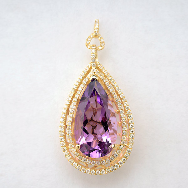 Centering one pear-cut amethyst weighing approximately 9.80 cts., accented by one hundred and thirty-five full-cut diamonds weighing a total of approximately 0.75 cttw., set in a 14k yellow gold, articulated bail mounting.