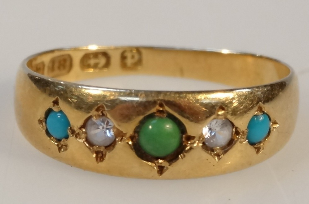 set with turquoise, etc, on a plain shank, size H, 2g all in.