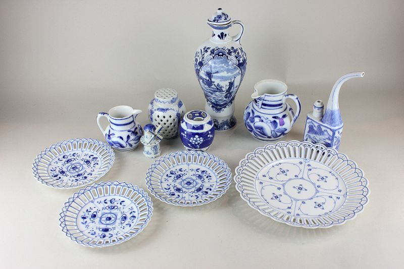 An assortment of European blue and white china including two jugs, a pot pourri jar and cover, three small plates and a matching larger plate, and a Japanese watering can