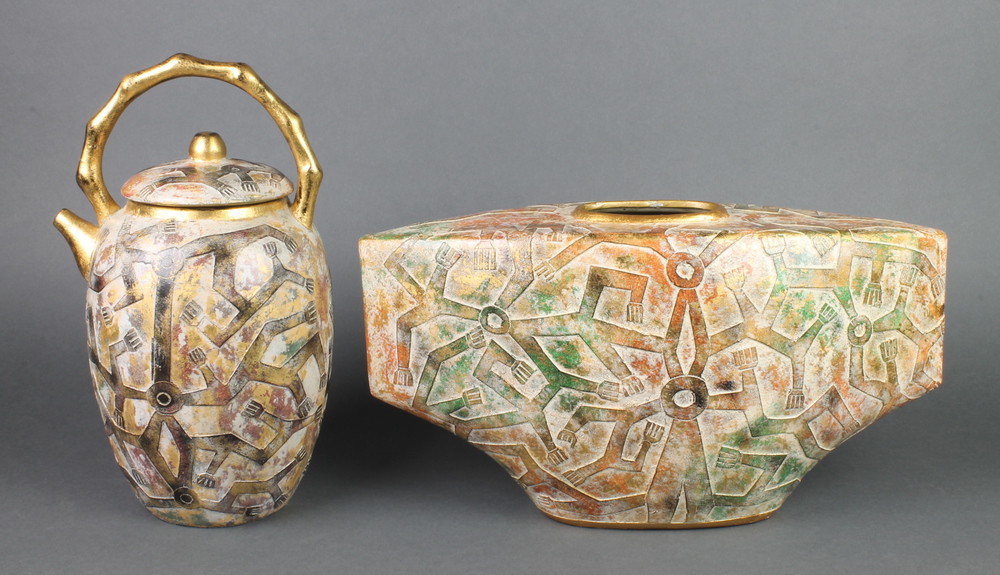 An Aztec style pottery boat shaped vase 8" and a ditto lidded jug 13"