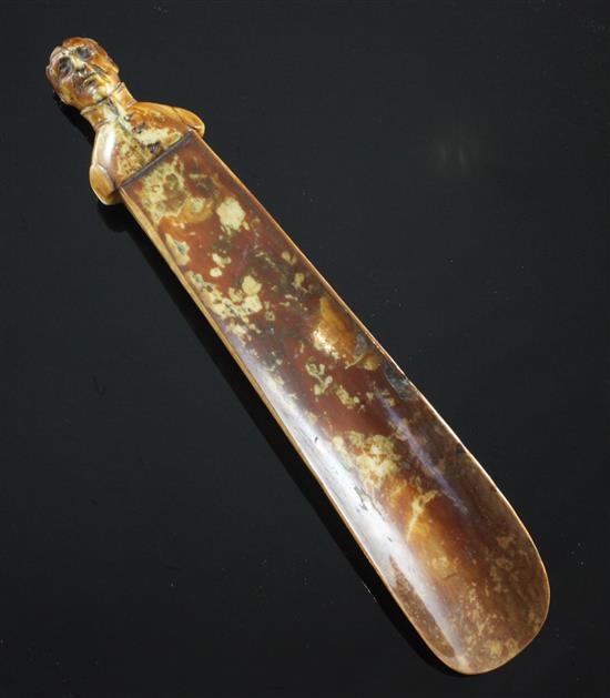 An early 19th century ivory shoe horn, carved with a portrait bust of the Duke of Wellington, 6.25in.