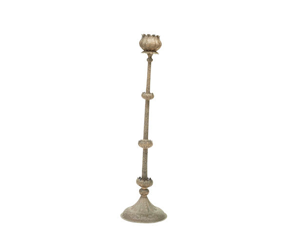 with pierced and floral foliate decoration, the lobed tulip shaped shade on knopped cylindrical stem and spreading circular base, later fitted for electricity