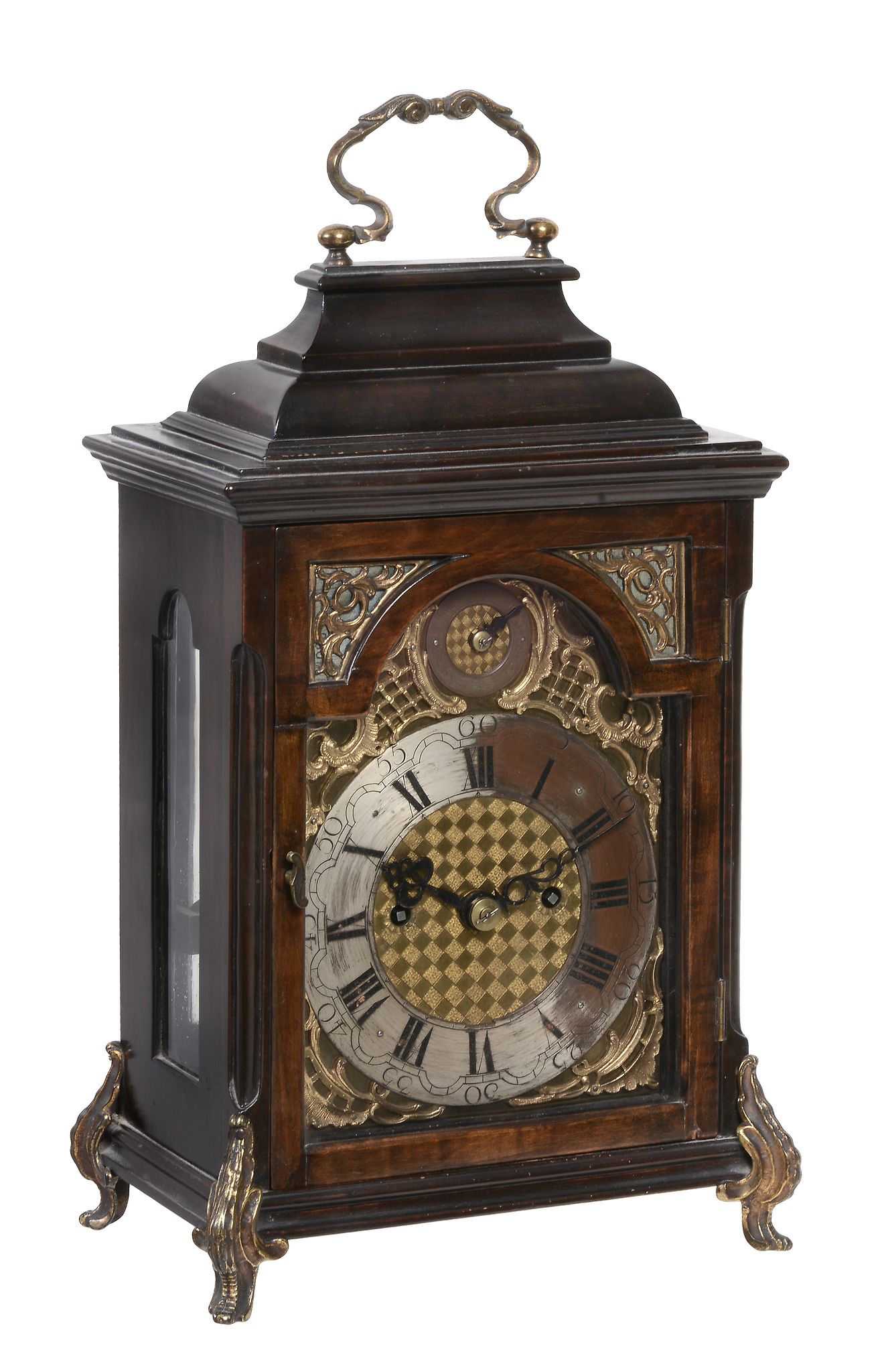 the late 19th century English four pillar eight-day twin chain fusee bell striking movement with anchor escapement, the 6 inch brass break-arch dial with Strike/silent subsidiary dial above silvered Roman numeral chapter ring with arcaded minute ring