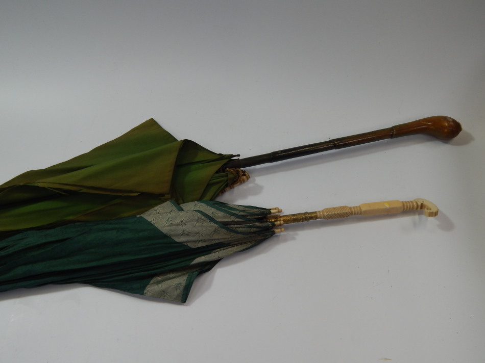 with brass shaft and carved ivory handle, and another green parasol with wooden shaft and handle