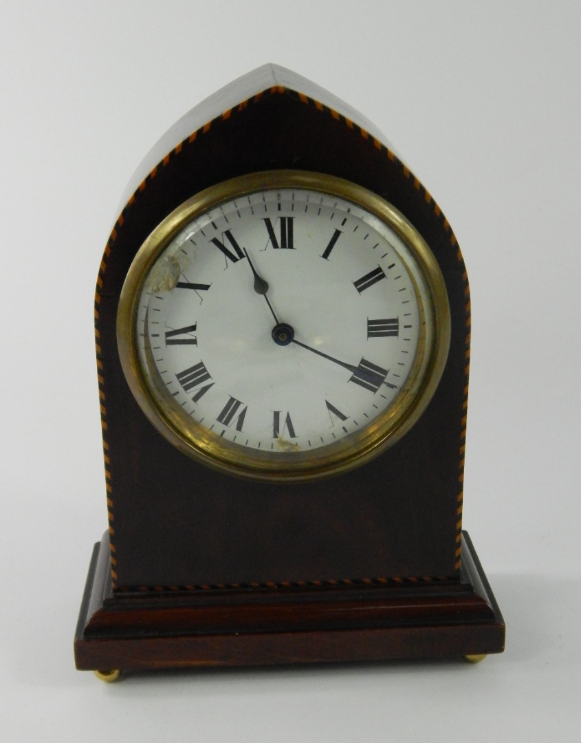 An Edwardian mahogany and chequer banded lancet mantel clock