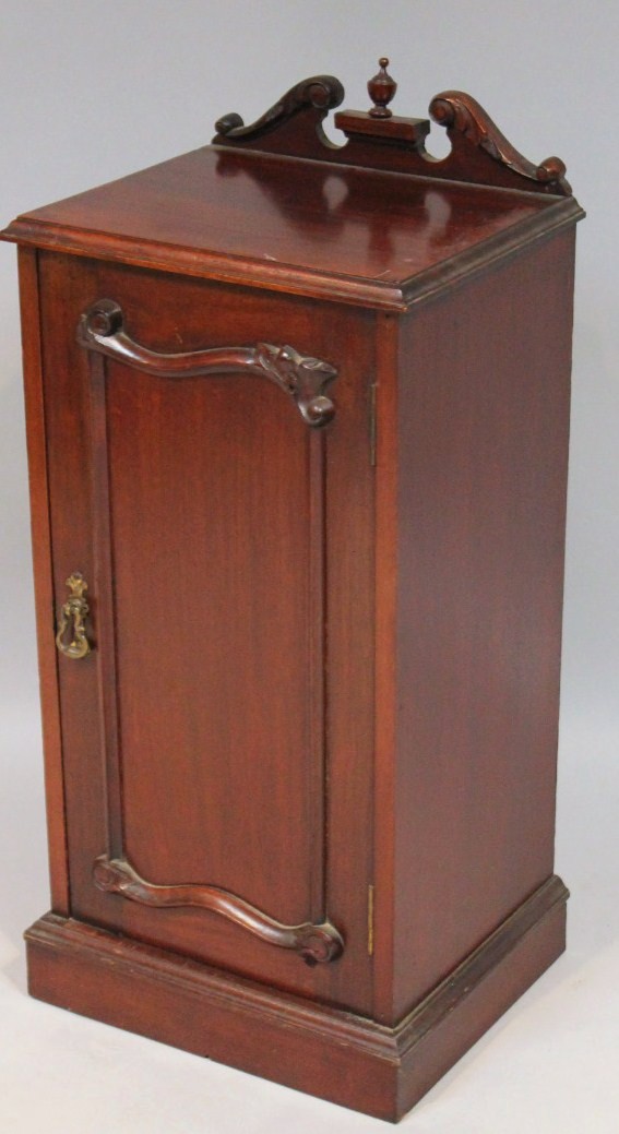 with a broken swan neck pedimented and urn cornice raised above a carved panel door revealing a shelved interior on a block base