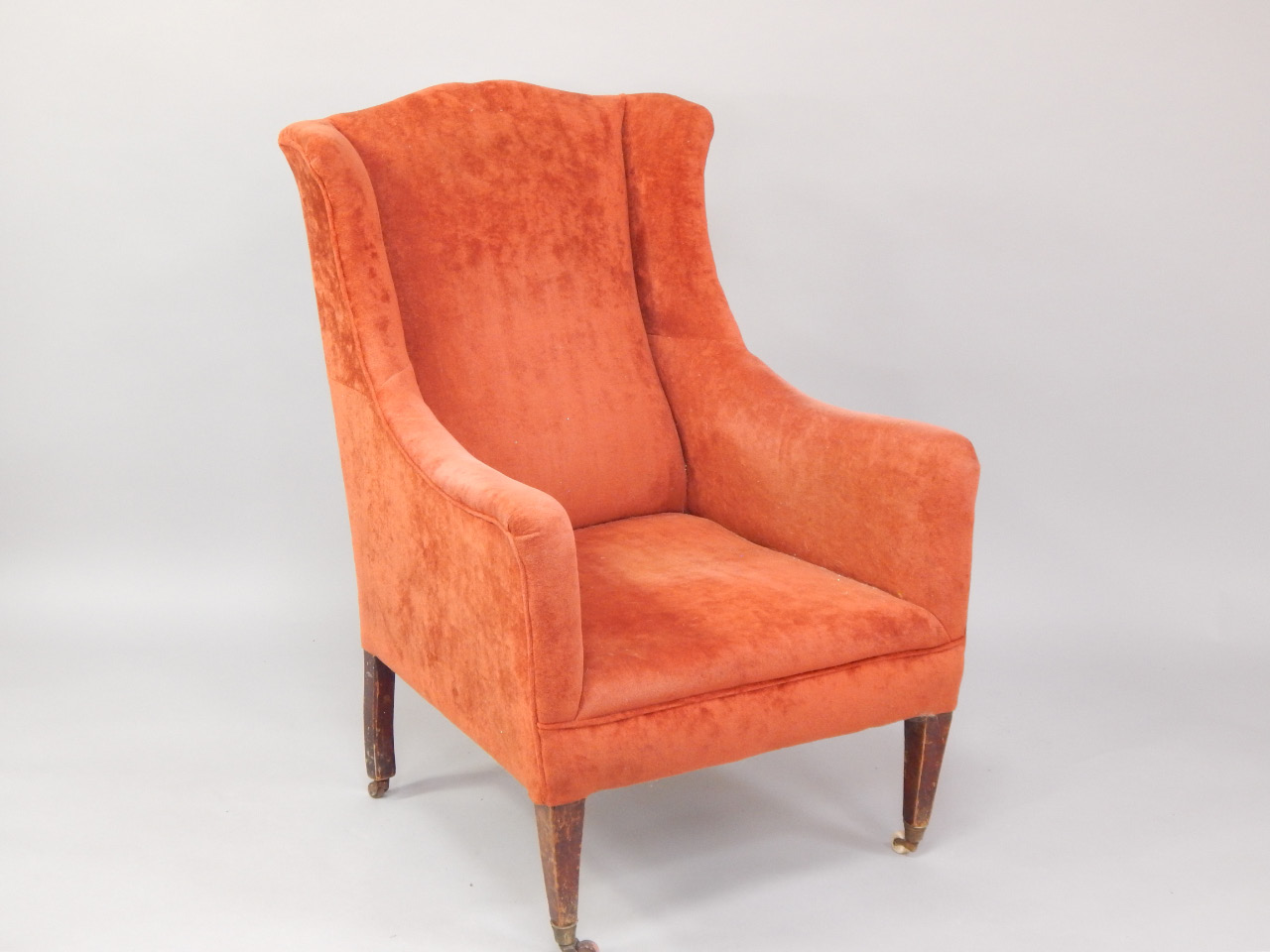 upholstered in terracotta draylon, raised on tapering, square legs, brass capped, on castors