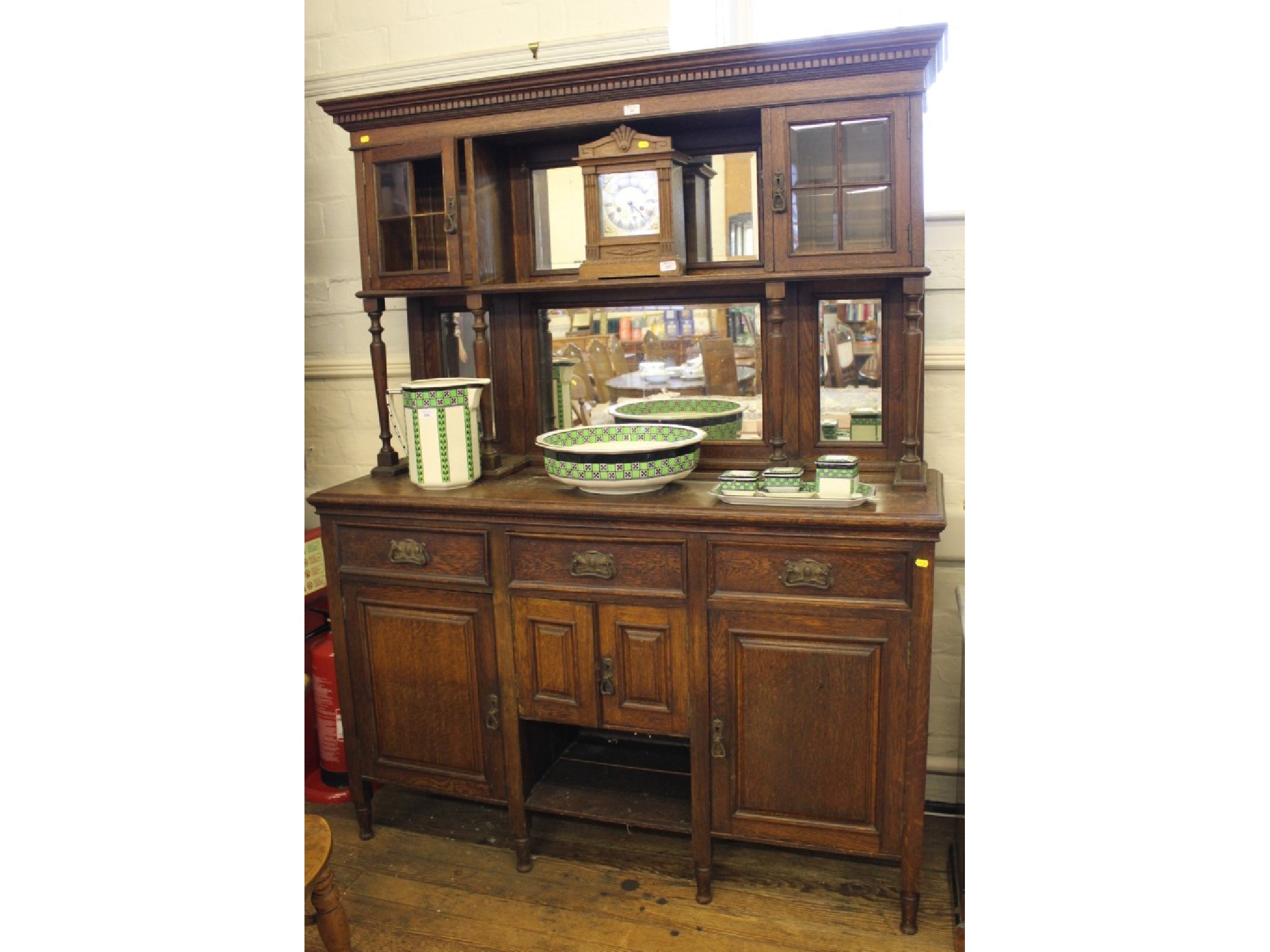 An Edwardian oak mirrorback dresser, with glazed cupboard doors, three frieze drawers over panelled doors on turned tapering leg