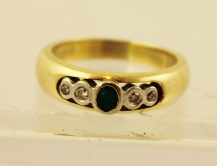 AN EMERALD AND DIAMOND GYPSY SET GOLD COLOURED METAL DRESS RING, having central oval emerald flanked by four diamonds, shank stamped .585, size R