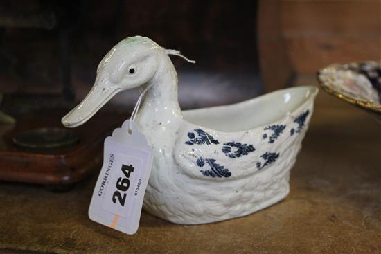 An English Creamware 'duck' sauceboat, c.1780, highlighted in blue and green, 17cm, restorations