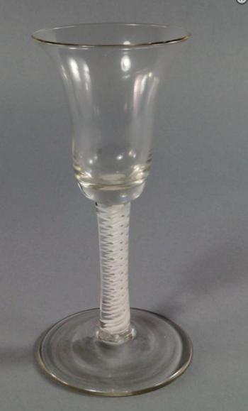 the bowl of inverted bell shape, on tall stem inset with opaque ribbon twist decoration, on spreading foot