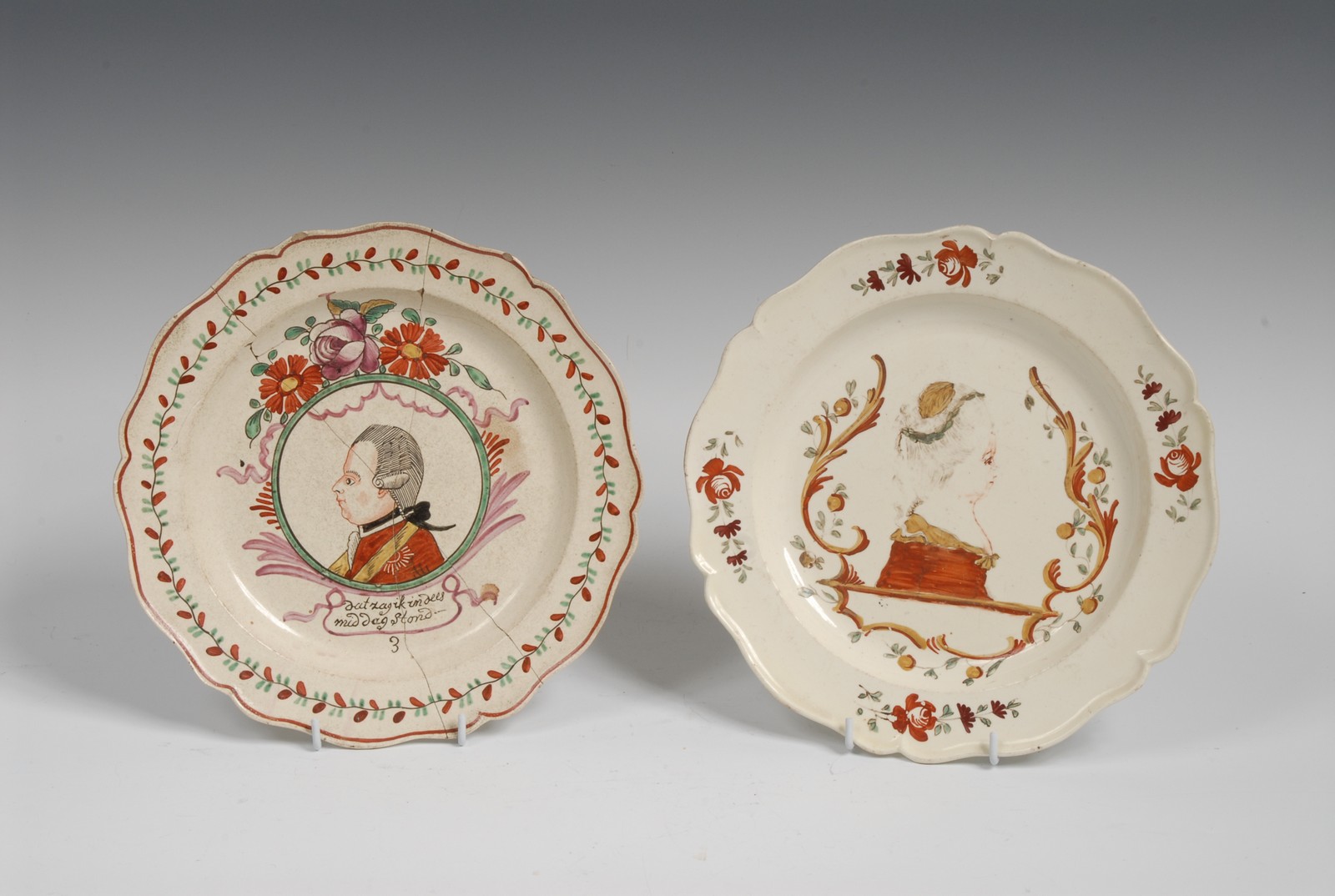 Dutch painted with portrait of Prince William V of Orange within a floral mounted circular cartouche, ... within a green and red foliate border, 24cm diam, c.1770; another, Princess Frederika Sophia Wilhelmina