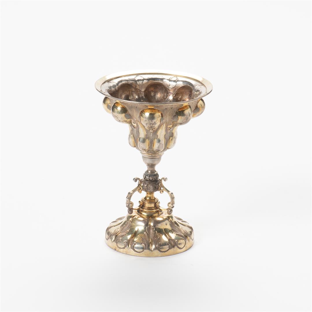 An English silver parcel-gilt chalice Mark of George Fox, London, 1907 The circular lobed foot is chased with a band of stylized leaves, the knobbed stem supports the lobed cup. H. 17.5 cm Weight approx. 361 g