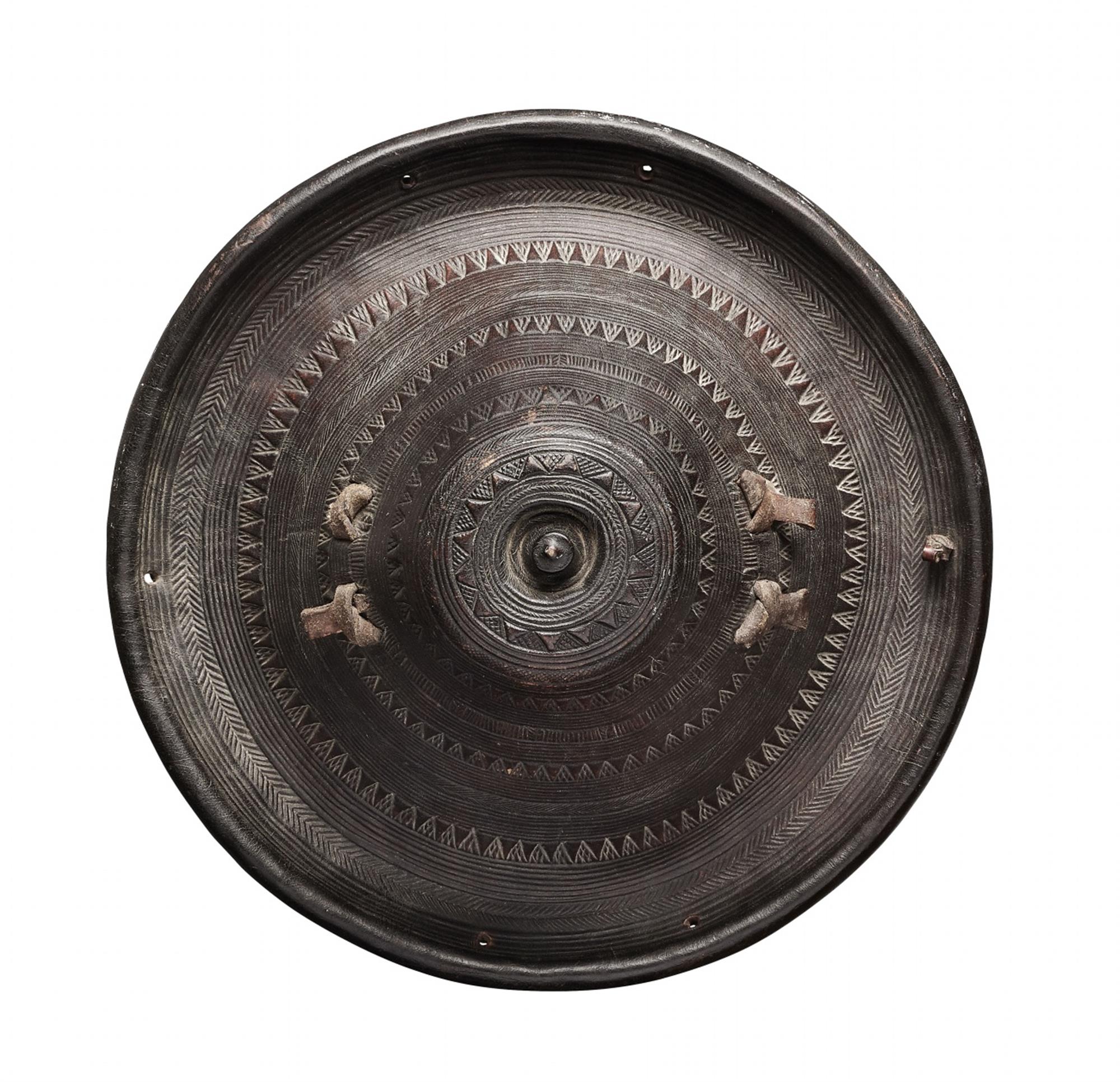 Of conical form with curled rim, with finely incised bands of geometric ornament, hide handle to rear.