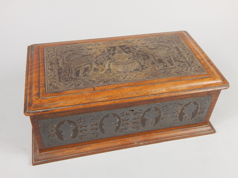 the lid and each side inset with silvered metal panels depicting deity, elephants, flowers