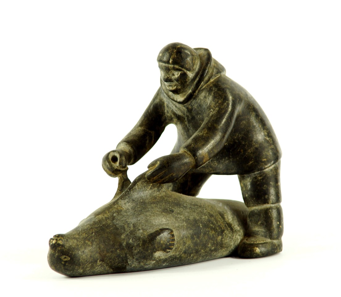 An Inuit serpentine carving of an eskimo, modelled standing skinning a seal