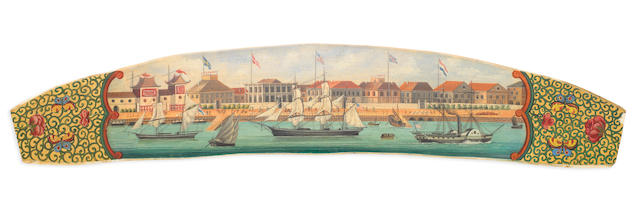 AN IVORY PANEL WITH A PAINTED SCENE OF CANTON, CIRCA 1860, 3 ½ x 17 ½in (8.5 x 44cm)