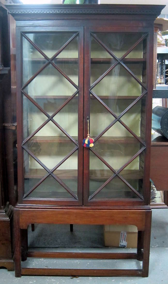 An oak and mahogany bookcase top with glazed astragal doors on stand 103cm wide