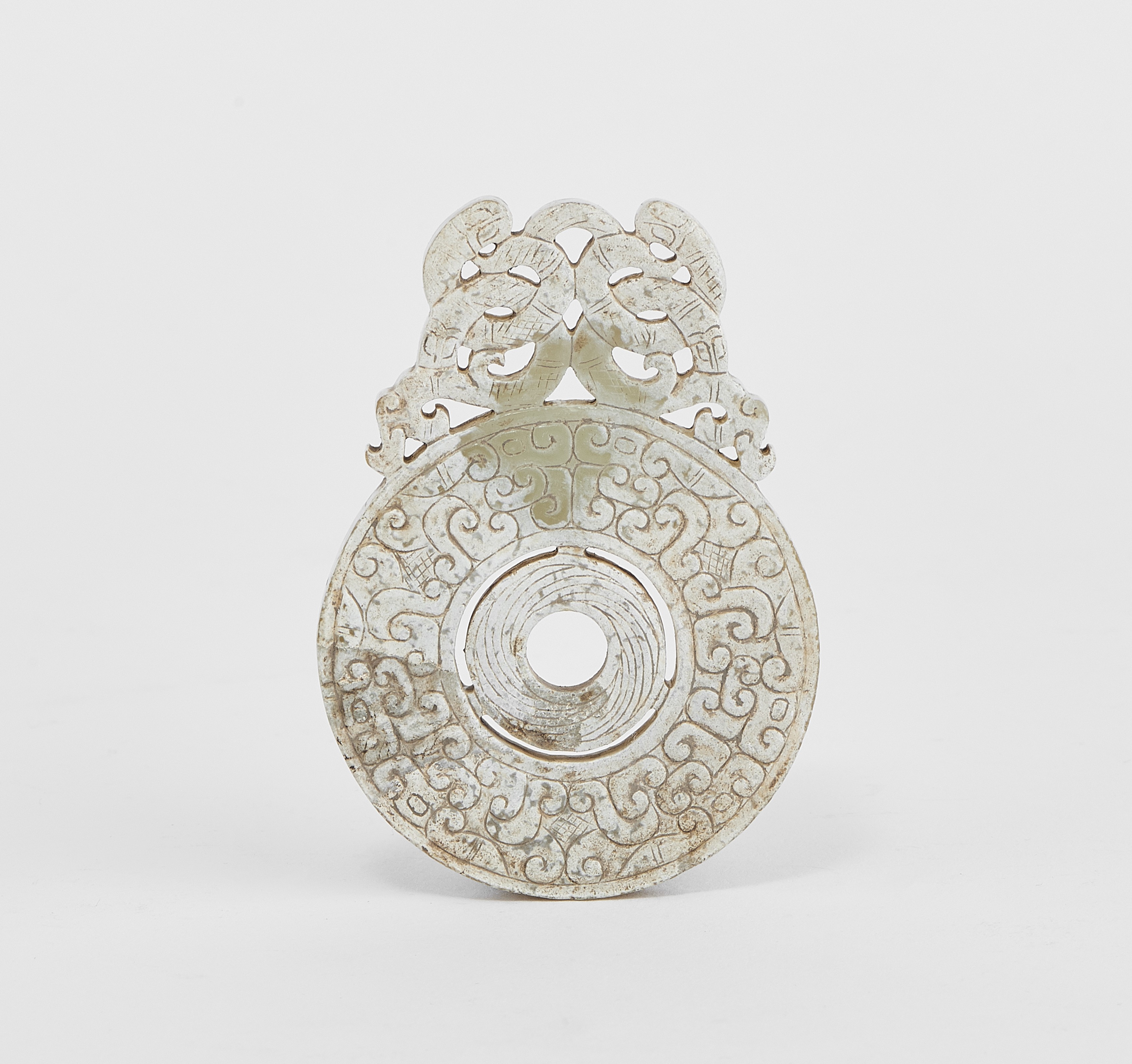 Clear jade adorned with two circles at a pediment pierced with interlacing