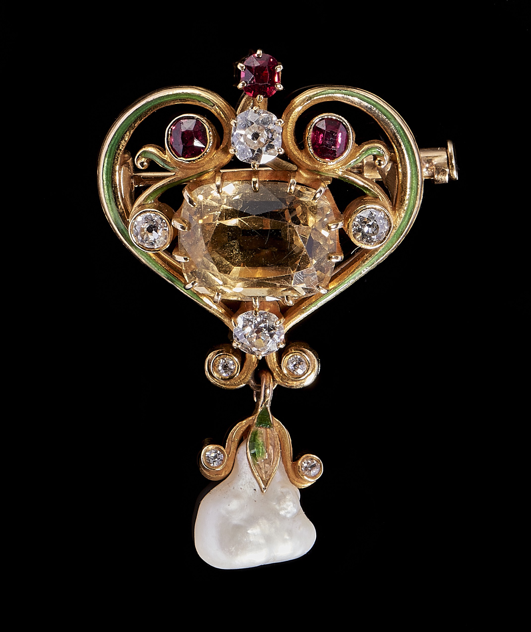 Art Nouveau enamelled transformation brooch set with a citrine surrounded