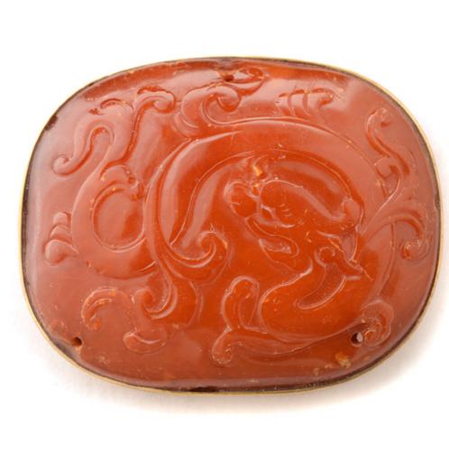 Featuring a Qing dynasty carved and pierced amber segment measuring approximately 37 x 46 mm, depicting a Chinese dragon, set in a 14k yellow gold pendant mounting. {Gross Weight: 7.8 dwts}