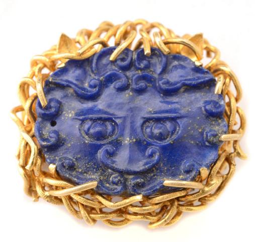 Designed as a beast featuring a carved lapis lazuli segment for the face, set in a 14k yellow gold mounting for the hair and ears and measuring approximately 34 x 37 mm. {Gross Weight: 10.9 dwts}