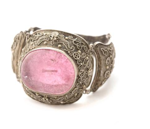 Featuring one ovoid shaped tourmaline segment measuring approximately 24 x 32 mm, set in an Asian silver, filigree mounting, completed by a tongue and groove clasp with safety chain, forming a 7 1/4 inch bracelet. {Gross Weight: 43.2 dwts}