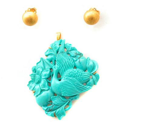 Including an carved turquoise segment depicting a stork with flowers, set in a 14k yellow gold pendant brooch mounting measuring approximately 46 x 40 mm together with a pair of 18k yellow gold, textured, half dome screw back earrings