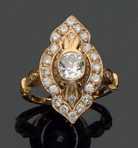 Attractive ring "marquise" in yellow, 750 mm, centered with a diamond pad size weighing about 1 carat diamond hemmed between two