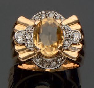 Attractive ring yellow gold fluted decor, MM 750, an oval centered citrine backed and surrounded by round diamonds