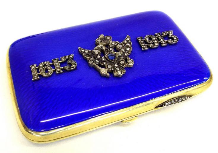 Attractive Russian silver-gilt and enamel cigarette case decorated with gem set '1613-1913' and a twin headed eagle