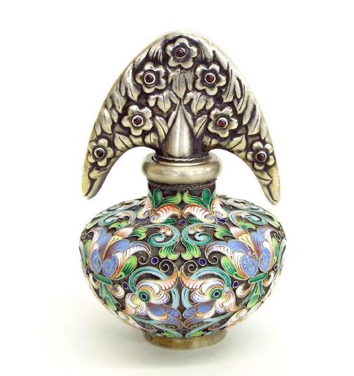 with arrow head shaped screw top with flowerheads and ruby cabouchon upon a baluster enamel bowl
